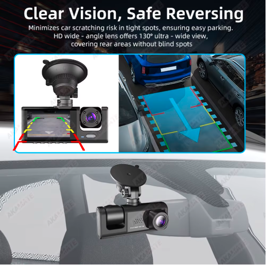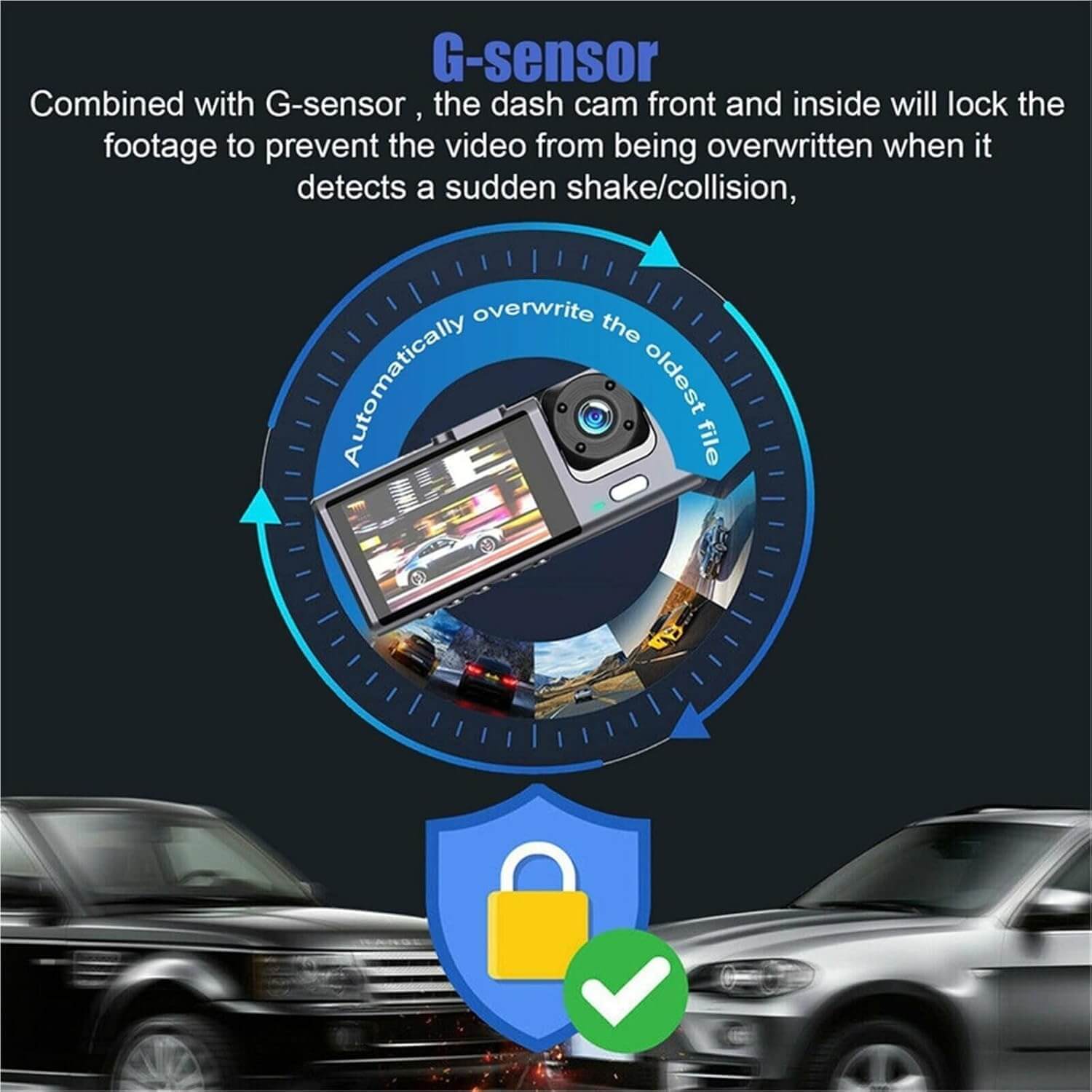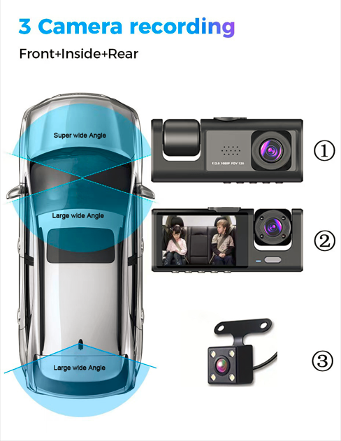 ☑ Couverture 360° : Les caméras à l'avant, à l'intérieur et à l'arrière enregistrent tout simultanément, de sorte qu'il n'y a pas d'angles morts.